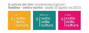 Per la III ed. della Notte della Cultura a Galatina quest'anno è di scena il cibo. Il cibo verrà raccontato fra antropologia e salute, fra natura e cultura, in un confronto con i suggerimenti della tradizione e con le grammatiche di base dell'immaginario alimentare in un creativo dialogo con il mondo dell'arte e dello spettacolo. Si parlerà di alimentazione tra cuochi, nutrizionisti, artisti e scrittori. Restando fedeli ad un format che ha riscosso successo nelle passate edizioni e che si fonda sui concetti di relazione, condivisione e appartenenza anche per la terza edizione della manifestazione che quest'anno si svolgerà sabato 30 agosto, tornano le installazioni all'aperto, le mostre, le presentazioni di libri e la musica sparsi per il centro storico della città.