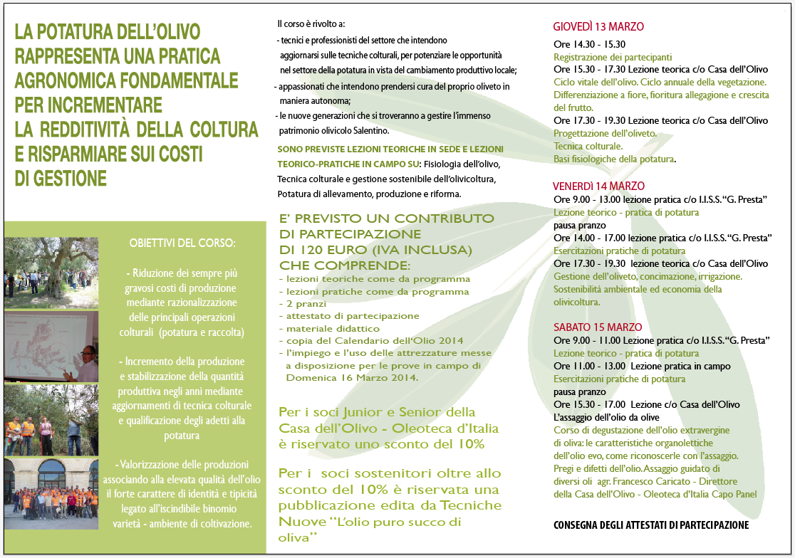 Il corso di potatura e degustazione si terrà a San Pietro in Lama, a pochi chilometri da Lecce, nei giorni 13, 14 e 15 marzo. Obiettivo del corso: abbattere i costi di produzione e puntare, nel medesimo tempo, sulla qualità degli oli a partire dall'adozione di tecniche di potatura più razionali e in linea con la modernità.